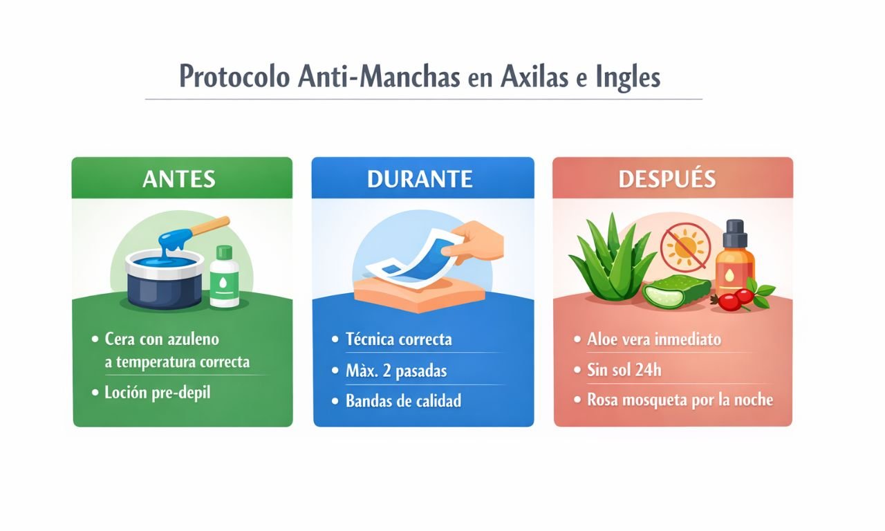 Las manchas oscuras en axilas e ingles no son un destino inevitable para quien se depila. Son la consecuencia de una hiperpigmentación post-inflamatoria que, en la mayoría de los casos, puede prevenirse con la combinación correcta de técnica de depilación, temperatura adecuada de la cera, cuidado post-depilatorio y rutina activa de aclarado.